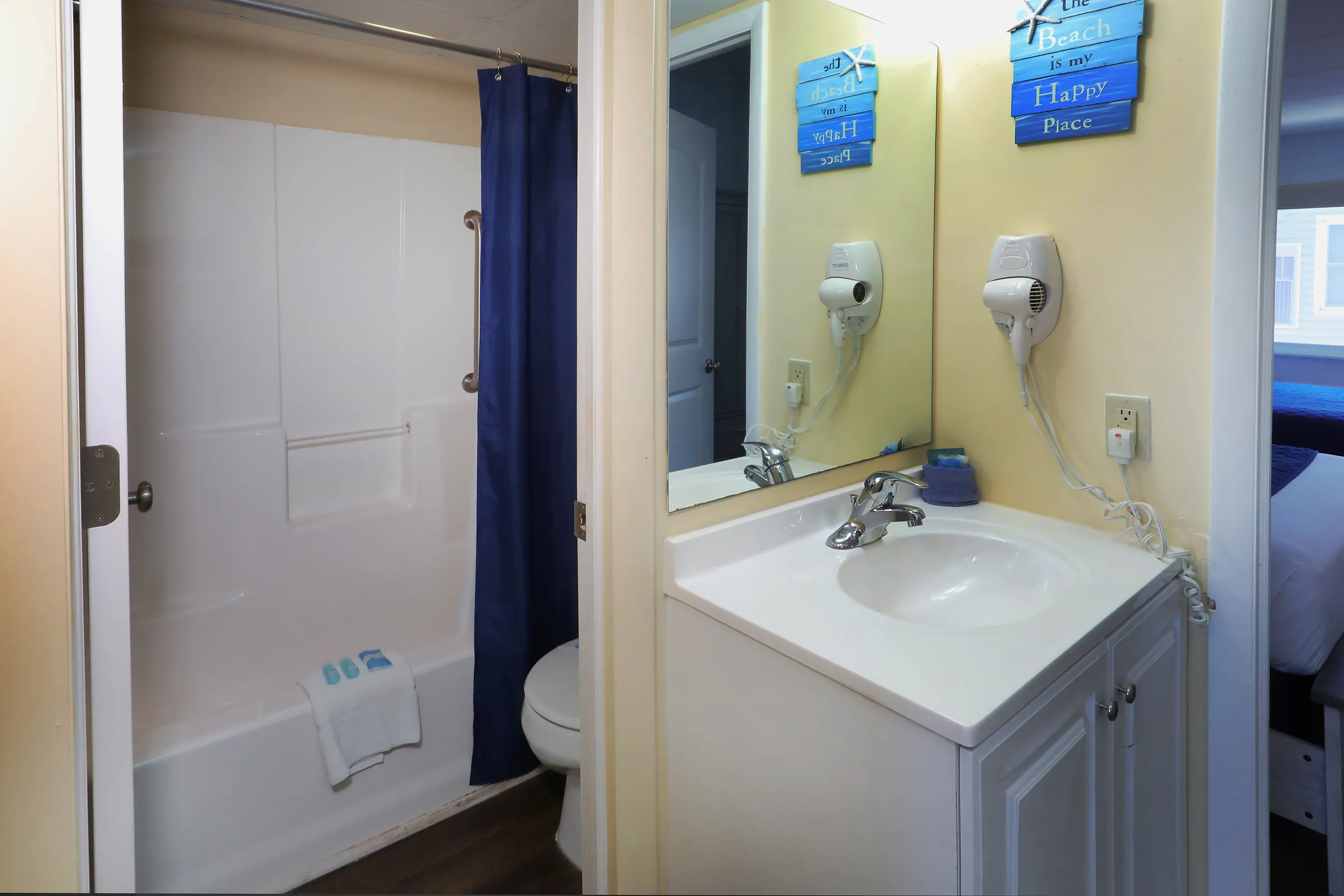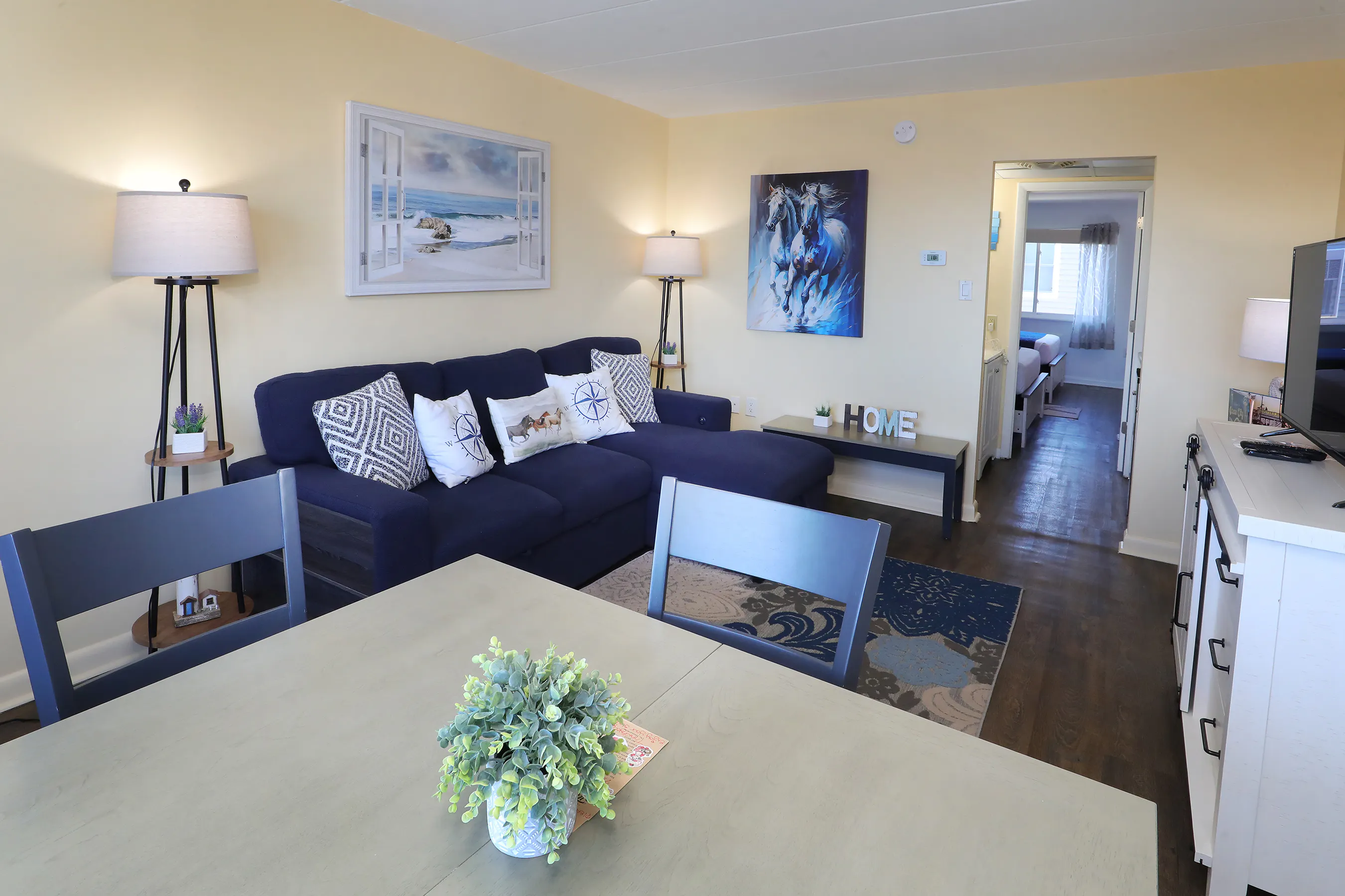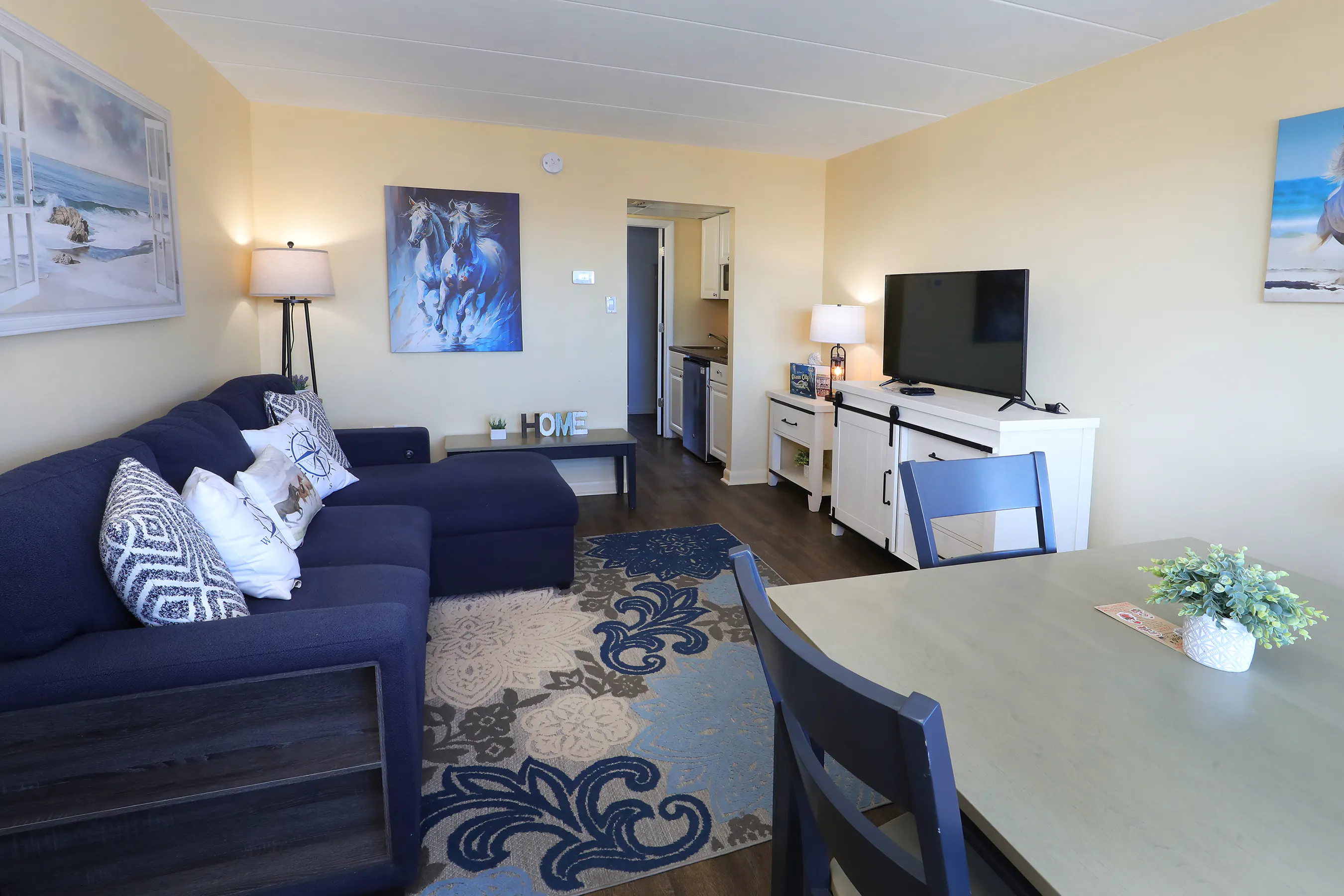 This hotel room boasts Two Queen Beds in the bedroom with a Queen size Sleeper Sofa in the living room, as well as two televisions and a heating/air conditioning unit.